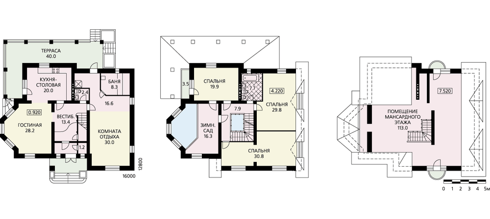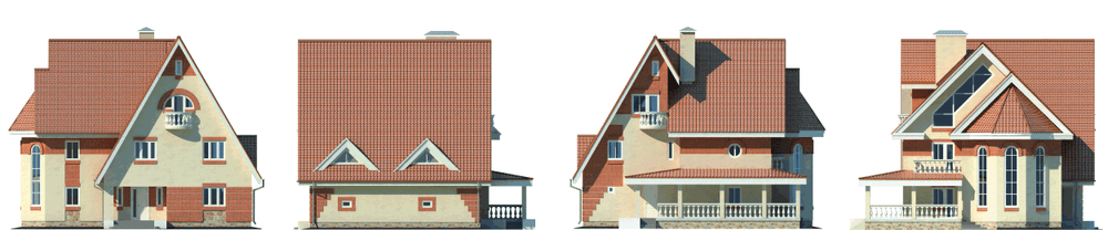 Особняк с выразительным, запоминающимся обликом, существенную роль в формировании которого играет высокая кровля и остроконечные фронтоны. Такие большие, низко спускающиеся скаты кровли потребуют качественного и красивого кровельного материала. В особняке три этажа и чердак, подвал отсутствует. Планировка дома предполагает не только комфортное проживание, но и полноценный отдых. Для этих целей на первом этаже создан блок релаксации с баней, душевой и комнатой отдыха, дополненный просторной террасой снаружи дома. Из жилых помещений на первом этаже расположены гостиная и смежная с ней кухня-столовая. Второй, частично мансардный этаж отдан спальным помещениям. Обычно утилитарная планировка спальной зоны в данном случае имеет свою изюминку – это зимний сад, расположенный на балконе второго света гостиной. Часть помещений этого этажа – мансардные. На последнем, полностью спрятанном под кровлю этаже расположено достаточно большое помещение, назначение и необходимость перепланировки которого определят сами хозяева дома.
