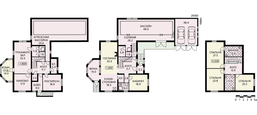 Этот дом с выразительными фасадами и комфортабельной планировкой свободно, без стеснения раскинулся по участку. Жилой дом, большой бассейн, гараж на два автомобиля удобно расположены и сблокированы между собой. Правда, они потребуют и большого земельного участка – габариты дома достаточно внушительны. На первом этаже жилого дома традиционно расположена гостевая зона, включающая в себя гостиную, кухню-столовую, веранду, в которой возможно оборудовать зимний сад, небольшой кабинет. Входной холл отделяет эту часть дома от бассейна, который, кроме самой чаши, длина которой, кстати, позволит проводить здесь полноценные тренировки, оборудован сауной со всеми сопутствующими служебными помещениями. К торцевой стене бассейна примыкает гараж. Все эти сооружения сблокированы таким образом, что образуют своеобразный уютный внутренний дворик. В мансардном этаже над жилой частью дома расположены три спальни и две ванные комнаты, над гаражом – комната отдыха, относящаяся к бассейну.