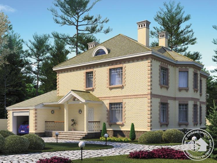 Двухэтажный загородный дом в классических традициях интересен по целому ряду показателей. Во-первых, это внешне привлекательное здание с хорошими пропорциями и продуманной отделкой. Во-вторых, его внутренняя планировка выполнена в перегородках, что позволит адаптировать ее под образ жизни конкретной семьи. И еще немаловажный момент – это вариативность предложенного решения. Так, существует вариант дома без гаража, с расположением котельной внутри жилой части дома (санузел сдвинут на место гардероба, котельная находится на месте санузла), и вариант отделки наружных стен – светлая штукатурка. В предложенном варианте дом имеет два этажа, большой чердак и пристроенный гараж. На первом этаже расположены гостевые помещения. Гостиная совмещена со столовой, которая решена с выразительным остекленным эркером – удобное место для круглого семейного стола. Жилая комната может служить гостевой или кабинетом. На втором этаже расположены спальни. Спальня хозяев со своей гардеробной и ванной комнатой максимально комфортабельна. Примечательна высота помещений обоих этажей – более 3 м. На чердаке ничего не мешает оборудовать бильярдную.