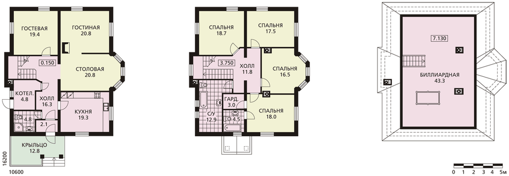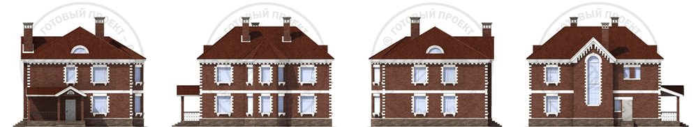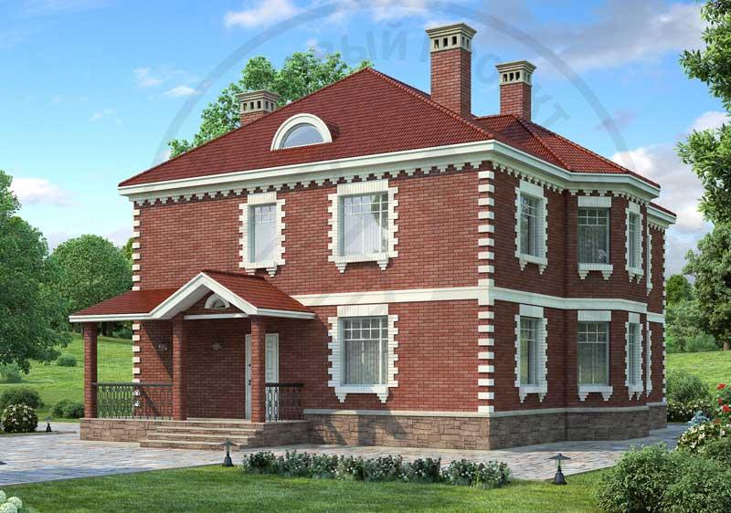 Двухэтажный загородный дом в классических традициях интересен по целому ряду показателей. Во-первых, это внешне привлекательное здание с хорошими пропорциями и продуманной отделкой. Во-вторых, его внутренняя планировка выполнена в перегородках, что позволит адаптировать ее под образ жизни конкретной семьи. И еще немаловажный момент – это вариативность предложенного решения. Так, существует вариант дома из газобетона с гаражом, с расположением котельной позади гаража, и вариант отделки наружных стен – светлая штукатурка. В предложенном варианте дом имеет два этажа и большой чердак. На первом этаже расположены гостевые помещения. Гостиная совмещена со столовой, которая решена с выразительным остекленным эркером – удобное место для круглого семейного стола. Жилая комната может служить гостевой или кабинетом. На втором этаже расположены спальни. Спальня хозяев со своей гардеробной и ванной комнатой максимально комфортабельна. На чердаке ничего не мешает оборудовать бильярдную.