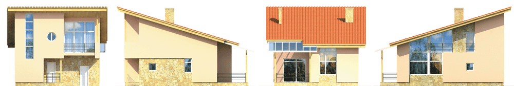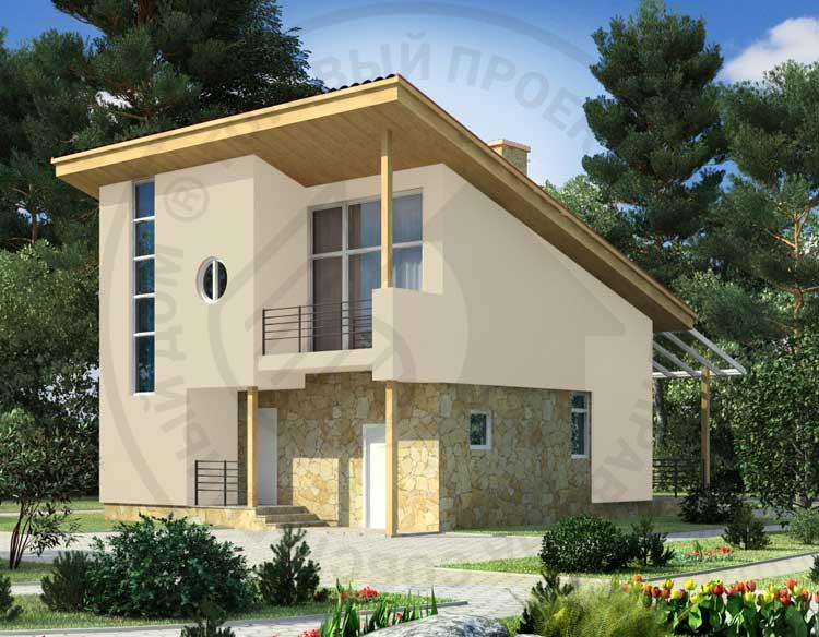 Дом эконом-класса с односкатной кровлей и выразительным внешним обликом. Небольшая площадь и рациональные архитектурно-конструкторские решения позволяют создать уютное и недорогое жилище для немногочисленной семьи. В доме один этаж и мансарда, подвал и чердак отсутствуют. На первом этаже запланированы гостиная и кухня-столовая. Из кухни-столовой можно выйти на улицу. В мансарде расположены две спальни и ванная комната. Стены коттеджа выполнены из крупноформатного керамического кирпича, особенностью которого являются повышенные теплотехнические свойства.