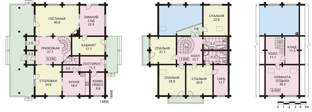 Большой по площади, логичный по планировке загородный дом для сезонного или круглогодичного проживания. Проще говоря, это дача для одной многочисленной семьи. В проекте предусмотрены три этажа, третий этаж полумансардный, скос потолка начинается на высоте 1.3 м от пола. Используется все подстропильное пространство. В доме нет подвала и чердака. Планировка решена по принципу необходимой достаточности, нет излишних по функции помещений. На первом этаже расположены гостиная и кухня-столовая, в большой прихожей расположена красивая спиральная лестница. На втором этаже предусмотрены четыре большие спальни и санузлы. Расположенный здесь же холл имеет выход на балкон второго света гостиной. В мансарде располагаются обширное помещение для досуга – бильярд, пинг-понг, а также подсобная комната.