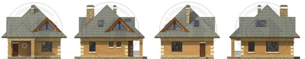 Планировка решена очень рационально, при этом предусмотрены все помещения, необходимые семье. Гостиная и кухня разделены перегородкой, от которой при желании можно отказаться. В гостиной проектом предусмотрен камин, под лестницей нашлось место для небольшой кладовки. На мансардном этаже расположены три спальни и ванная комната. До минимума сведена площадь холла - 2,2 м.кв. Мансардный этаж полностью спрятан под кровлю, что привело к появлению мансардных окон - они предусмотрены в большой спальне и ванной комнате.