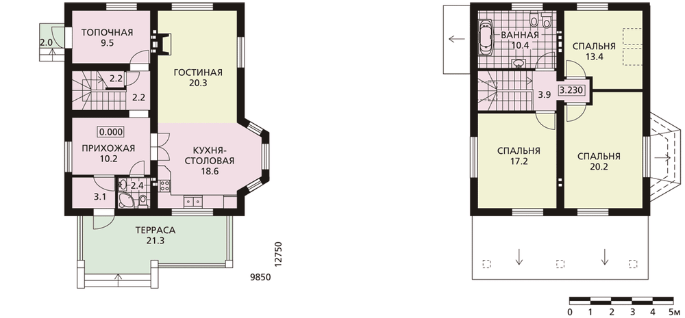 Удачное сочетание скромного внешнего вида, рациональной планировки и экономичности – неоспоримые достоинства проекта. В доме два жилых этажа, отсутствует заглубленный цокольный этаж. На первом этаже гостиная и кухня-столовая являются единым помещением. Также здесь расположена топочная, прихожая и ванная комната. Второй этаж решен более чем комфортно: три просторные спальни сгруппированы вокруг лестничного пролета, а в большой ванной можно разместить джакузи.