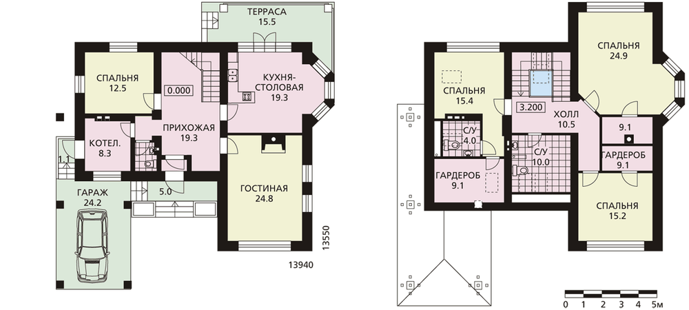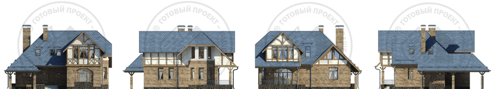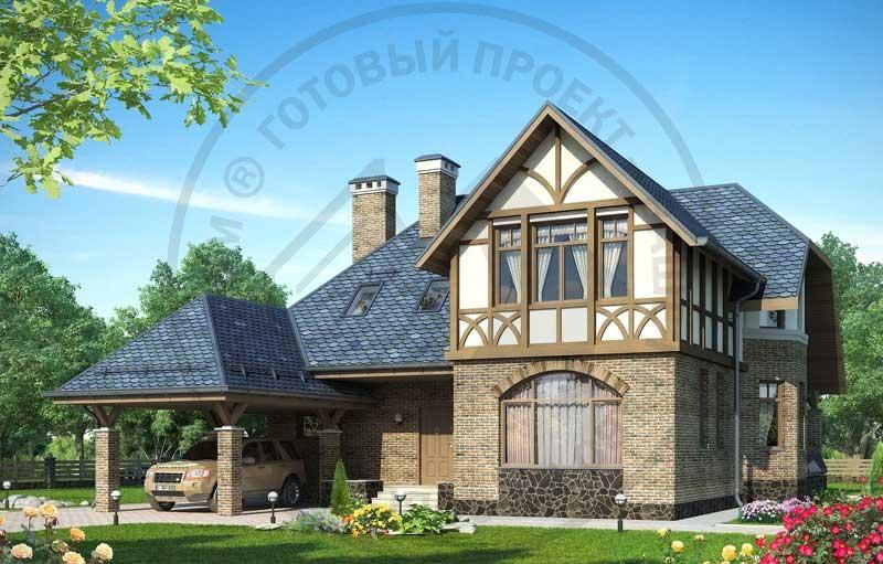 Роскошный дом в английском стиле с оригинальной отделкой. В отличие от аналога, проекта M-1310-0, данный коттедж не сблокирован и предназначен для одной семьи. Первый этаж – зона дневного пребывания с просторной гостиной, кухней-столовой и небольшой жилой комнатой. Расположенная в удалении от жилой зоны котельная имеет свой выход на улицу. Для автомобиля существует навес. На втором этаже удалось применить принцип зонирования. Две спальни сблокированы вместе, у каждой есть своя гардеробная комната. Третья спальня изолирована и имеет свою ванную и гардеробную.