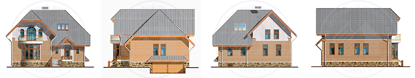 Современный коттедж с мансардным этажом под скатной кровлей, с гаражом на два автомобиля в цокольном этаже. Габариты дома применимы для небольшого участка. Коттедж имеет выразительный главный фасад с четко организованным главным входом и овальным эркером, с балконом над ним. Здание двухэтажное с цокольным этажом под частью здания. Планировка первого этажа решена в свободной манере открытого пространства, с открытой красивой лестницей в гостиной. Светлая гостиная с камином и эркером, к ней примыкает кухня-столовая, вместе они образуют общее пространство для всей семьи. Из тамбура автономный спуск в цок. этаж к гаражу. Гостевая комната, санузел и техническое помещение с газовым отопительным котлом и бойлером горячей воды расположены в повышенной зоне первого этажа, приподнятой на 0,5 м. для удобства въезда в гараж. На втором этаже четыре уютных спальни, большая имеет выход на овальный балкон главного фасада. Одна большая ванная комната имеет естественное освещение.