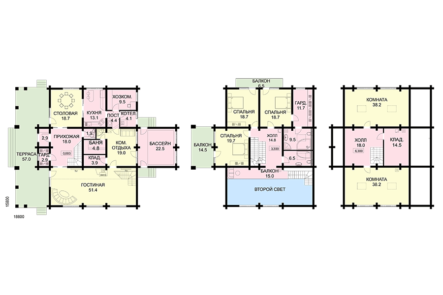 Солидный и компактный, с оригинальными фасадами, простой по планировке загородный дом из оцилиндрованного бревна D-240 мм. для круглогодичного проживания одной семьи, есть возможность принимать гостей. В проекте предусмотрены два этажа, мансардный третий этаж с наклонными потолками кровли. Используется все подстропильное пространство. В доме нет подвала и чердака. Монолитная плита основания позволит использовать для строительства даже участки со сложными грунтами. Планировка решена по принципу необходимой достаточности, нет излишних по функции помещений. На первом этаже расположены двухсветная гостиная с внутренним балконом и кухня-столовая, санузел, хозяйственная комната, котельная, сауна с душем, комната отдыха, бассейн. На 2 этаже предусмотрены три спальни с балконами, два санузла, выход на внутренний балкон гостиной. На мансардном этаже расположены две комнаты и подсобное помещение. Главный фасад разработан по принципу симметрии, доминирует большая терраса над главным входом лоджии и больших балкона в центре фасада, придающие индивидуальный облик этому жилому дому.