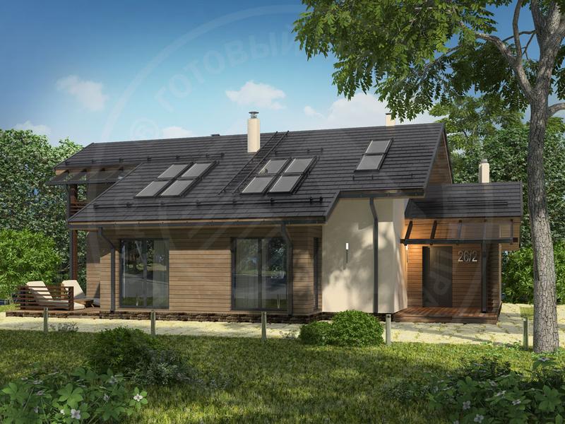 Ширина корпуса этого просторного дома больше 10 метров, и это как раз тот случай, когда без мансардных окон не обойтись. Их активное использование в данном проекте решает не только интерьерные задачи, но и обогащает архитектурный образ дома. Фасадное решение здесь выполнено в скандинавских традициях, которые не предполагают избыточного остекления. Такой дом смотрится уютным и защищенным, да, собственно говоря, таковым и является. Между тем, именно благодаря блокам из нескольких мансардных окон, этот дом становится по-настоящему светлым. Это как раз тот самый случай, когда можно говорить о крыше именно как о полноценном "пятом фасаде". Причем мансардные окна освещают здесь не только второй этаж: вы можете пустить солнечный свет и на первый – через окна второго света.