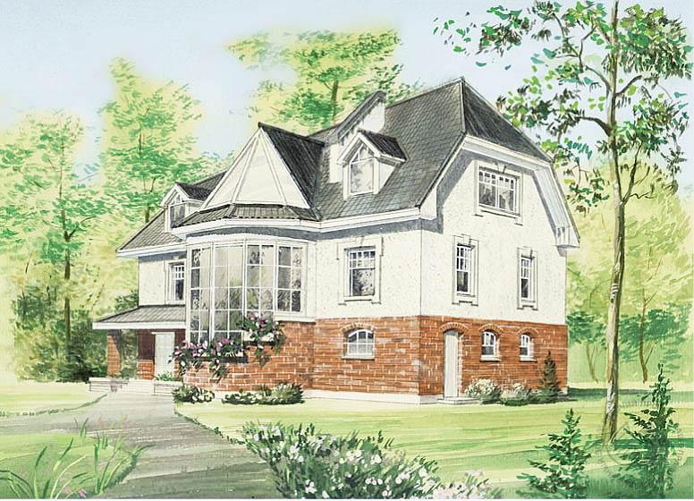 Большой кирпичный особняк интересен прежде всего необычным решением внутреннего пространства. В центре дома расположены бассейн и зимний сад, большие остекленные эркеры задают центральную ось дома. Для подъема на второй этаж, кроме обычной лестницы, предусмотрен эффектный пандус, плавной дугой огибающий место, предназначенное для бассейна. Все три этажа объединены как функционально, посредством лестницы и пандуса, так и визуально. Для этого создан «световой колодец», пронизывающий все пространство дома. Нетрадиционным является конструктивное решение – металлический каркас по периметру и центральному пролету здания.