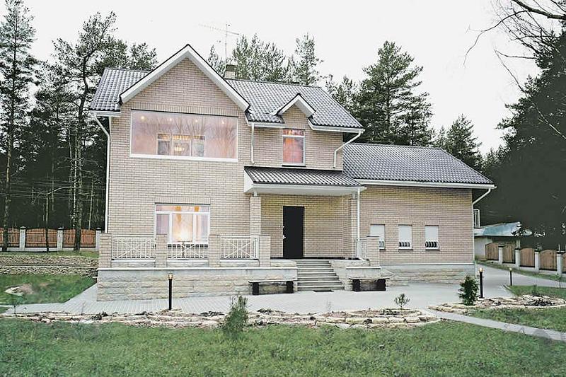 Лаконичная, рациональная планировка дома сочетается с четким рисунком фасадов. К большому жилому объему пристроен гараж на два автомобиля. В доме прослеживается традиционное для коттеджного строительства поэтажное зонирование. Всю площадь цокольного этажа занимает зона релаксации, с большим бассейном, сауной, комнатой отдыха. Логичным кажется и размещение здесь котельной, спуститься в которую можно из помещения охраны на первом этаже. Первый этаж отдан зоне дневного пребывания семьи. Гостиная с кухней-столовой образуют единое пространство, занимая целый пролет здания. Такое решение дает большую свободу в оформлении интерьеров. Из прихожей можно попасть в бильярдную, расположенную на промежуточном уровне, и в мансарду, в спальную зону дома.