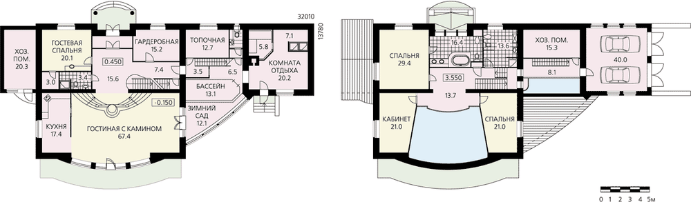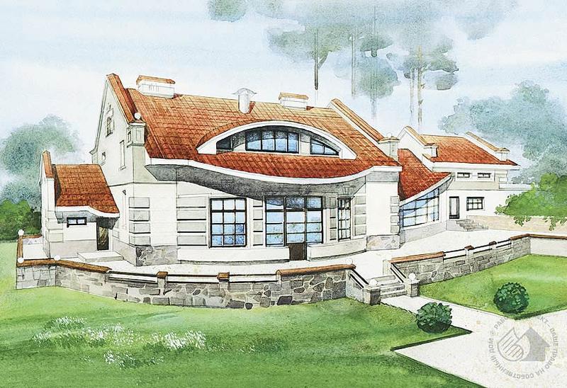 Двухэтажный жилой дом, который можно возводить по блокам. На начальном этапе возводится основной объем помещений – жилой. Два боковых блока достраиваются по мере необходимости. Тем более что один из них не связан с внутренним пространством жилой части. В основном объеме на двух уровнях – все, что нужно семье, способной оценить удобство и гармонию пространств. В большой двусветной гостиной с камином выделены различные функциональные зоны. При всех жилых комнатах – ванные и гардеробные. Так как дом разработан для участка со значительным перепадом рельефа, гараж находится на верхней отметке участка. Под частью дома есть подвал, куда ведет лестница из шлюза в прихожей.