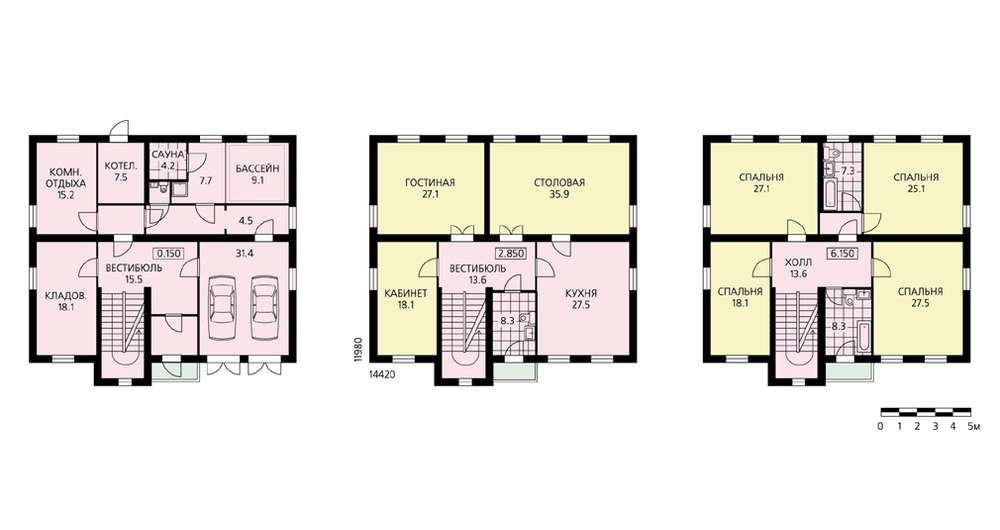 Компактный и комфортабельный двухэтажный особняк может стать постоянным жилищем семьи, состоящей из нескольких поколений. Особенность проекта в том, что все этажи дома запроектированы выше уровня земли. Исключением является небольшой погреб площадью 27.5 м2, расположенный слева от лестницы (не показан на планах). Главный вход в дом решен на уровне земли в цоколе, где помимо прихожей расположены подсобные помещения, сауна с бассейном и гараж. Два жилых этажа дома решены традиционно, в соответствии с принципом поэтажного зонирования. На втором этаже расположена гостевая зона, на третьем – спальная. Функциональное назначение помещений второго этажа вполне может быть изменено. В доме есть неотапливаемый чердак, в котором можно разместить летние спальни.