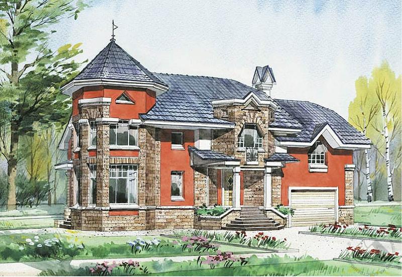 Перед вами особняк, который, несомненно, сможет стать украшением любого коттеджного поселка. Пластика фасадов с тонко прорисованными деталями и красивой угловой башней создает неповторимый образ этого дома. Через тамбур первого этажа мы попадаем в холл, объединенный с гостиной в одно большое пространство, из которого можно попасть в гараж и блок технических помещений. С левой стороны от холла находятся кабинет и большая кухня-столовая. Расположение столовой в светлом многогранном эркере кажется особенно привлекательным. Красивая многомаршевая лестница ведет на второй этаж, спальную зону дома. В данном варианте предлагаются еще две гостиные, расположенные на разных уровнях, которые вместе со смежными с ними спальнями образуют изолированные группы помещений.