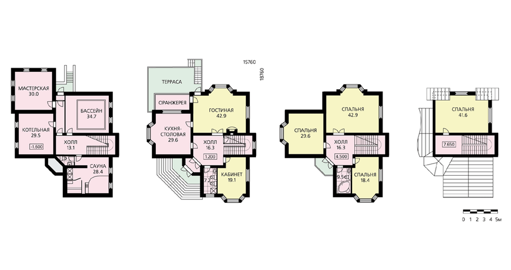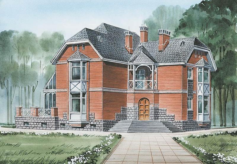Для состоятельных заказчиков, мечтающих иметь собственное родовое поместье, этот дом – настоящая находка. Красивые, богато декорированные фасады сочетаются здесь с высоким уровнем комфорта. Угловое решение входной зоны с многоступенчатой лестницей делает возможным постановку дома на угловом участке. Важно не втискивать дом в плотную застройку, а обеспечить достаточный для его обзора простор. И тогда он может стать настоящей архитектурной доминантой окружающей среды. По планировке и набору помещений дом отвечает самым высоким требованиям, предъявляемым к современному коттеджному строительству. В цокольном этаже запроектирована зона релаксации с сауной и бассейном. Отсутствие встроенного гаража дает возможность разместить в доме больше жилых помещений.