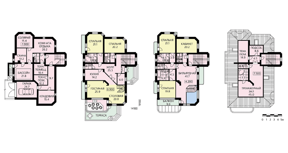 Можно с уверенностью сказать, что проект этого дома не останется незамеченным. Даже если в ваши планы не входит строительство большого, представительного особняка, равнодушно пройти мимо него нельзя. Этот проект привлекает внимание изысканными, тонко прорисованными фасадами, продуманной, рациональной планировкой. Украшением дома являются витражи, это и двусветный витраж гостиной, и витражи спальни и лестницы. Они не только являются акцентами на фасаде, но во многом формируют внутреннее пространство дома. Планировка не имеет жесткого поэтажного зонирования. Так, на первом этаже с зоной дневного пребывания соседствует спальная зона. А на втором, спальном этаже расположилась бильярдная. Но такое соседство не приводит к дискомфорту проживания благодаря изолированности помещений.