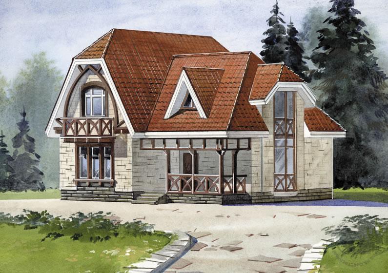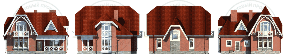 Гармоничность и уравновешенность фасадов, рациональность планов – все это превращает дом в целом в очень гармоничную, рациональную постройку. А отсутствие заглубленного цокольного этажа, избыточных помещений и транзитных зон делает дом еще и достаточно экономичным. На первом этаже помимо помещений дневной зоны находится жилая комната, что очень удобно для разновозрастной семьи. В мансарде три спальни, две из которых имеют вместительные гардеробные, и небольшая ванная комната. В отделке фасадов использован искусственный облицовочный камень. Элементы фахверка, присутствующие на фасадах, являются чисто декоративными и не выполняют никакой конструктивной функции, при желании от них можно отказаться или заменить другими элементами отделки.