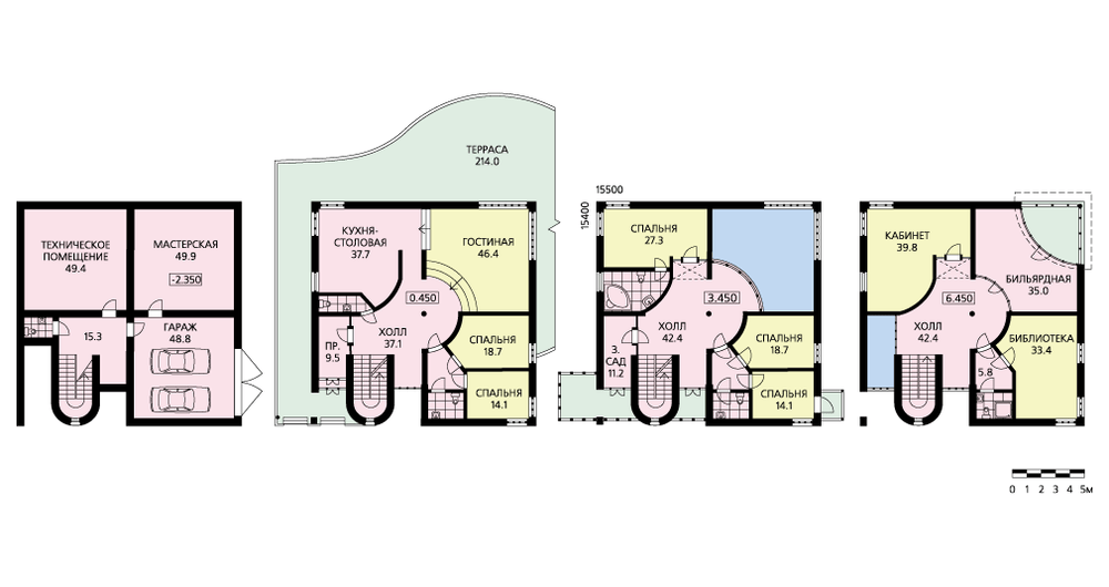 Этот дом, выполненный в традициях конструктивизма, поражает оригинальностью и одновременно простотой своих форм. Строгость правильного кубического объема нарушается полукруглой лестницей, выступающей из застекленного портала входной зоны. Удачным приемом можно считать сочетание лаконично решенного объема здания с изысканной внутренней планировкой и большой, сложной формы террасой, окружающей дом. В доме четыре уровня, три из которых жилые. На первом этаже большая светлая гостевая зона, решенная в свободной планировке, соседствует со спальной зоной. Такой прием удобен для семьи, состоящей из нескольких поколений. Здесь могут жить старшие члены семьи. Спальная зона второго этажа также имеет свое зонирование: детские спальни выделены в самостоятельный блок.