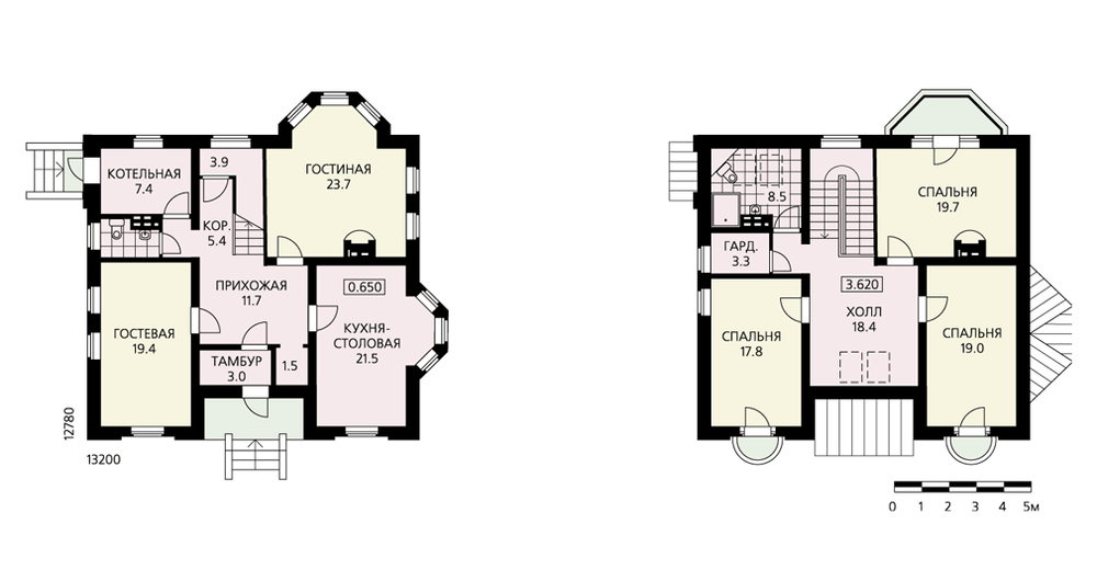 Элегантные, тонко прорисованные фасады и продуманная, логичная планировка не могут не привлечь внимание к этому проекту. Объем дома оптимален – площади всех комнат достаточны, но не чрезмерны, отсутствуют избыточные, малофункциональные помещения. А отсутствие заглубленного цокольного этажа и максимальное использование подстропильного пространства делают этот дом еще и экономичным. Помещения первого этажа, зоны дневного пребывания, имеют двустороннюю ориентацию, что обеспечивает их максимально комфортное освещение и облегчает посадку дома на участок. Нельзя не отметить и одинаково тщательную прорисовку всех четырех фасадов, что делает удачной абсолютно любую точку восприятия дома. Особенно хорошо он будет смотреться на открытом, не затесненном участке.