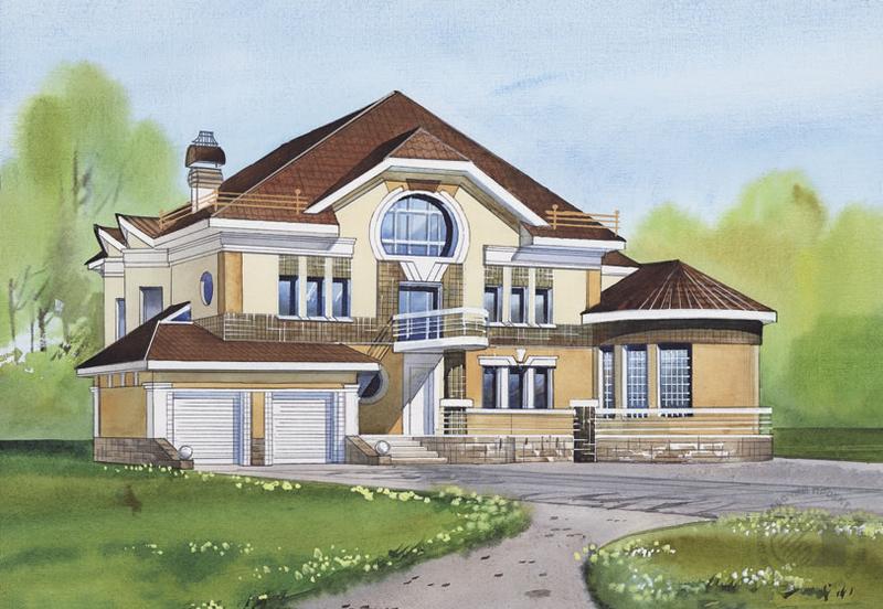 Великолепный респектабельный особняк, решенный на той же планировочной основе, что и J-0966-0, только с расширенным составом помещений. Прежде всего это относится к первому этажу, дополненному зоной релаксации с бассейном, сауной, зимним садом и тренажерной. От гостевой зоны она отделена стеклянной перегородкой, а установка цветных стеклопакетов позволяет создать здесь необычную игру света. Гостевая зона представляет собой единое, наполненное солнцем и воздухом пространство. По изящной дугообразной лестнице отсюда можно подняться на второй этаж, где наряду со спальными комнатами размещены малая гостиная и игровая, из которой открывается великолепный вид на зимний сад и бассейн первого этажа. Винтовая лестница ведет на мансарду, в просторную студию с камином и баром. Ее площадь составляет 187.6 м2 (не включена в общую площадь), на планах она не показана.