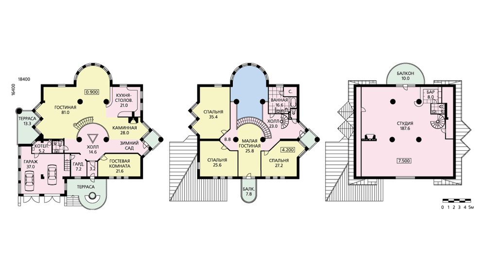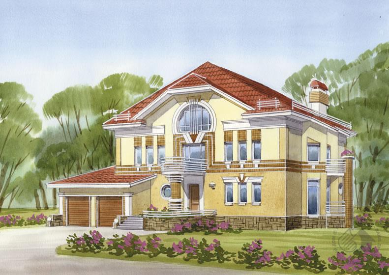 Элегантная респектабельность – пожалуй, эта характеристика наиболее полно отражает характер дома. Утонченная элегантность присутствует не только в его внешнем облике, но и в планировке. В то же время дом выглядит основательным и незыблемым и полностью соответствует облику комфортабельного и уютного семейного очага. В доме два жилых этажа и просторная студия в мансарде (площадь мансарды не включена в общую площадь). С учетом мансарды площадь дома составляет 572.9 м.кв.Первый этаж – интересно решенная гостевая зона. Центр этого пространства оформлен декоративной стенкой из цветных стеклоблоков и фонтаном. По изящной дугообразной лестнице можно подняться на второй этаж, в спальную зону дома. Типовой набор помещений дополнен здесь малой гостиной и просторным холлом, с балконов которого открывается великолепный вид на второй свет гостиной.