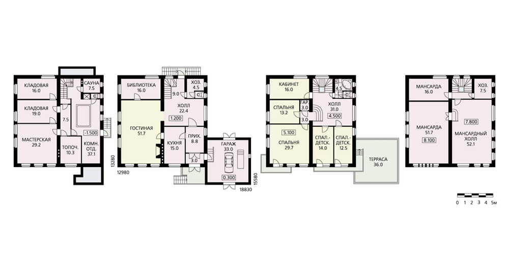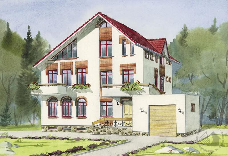 Предлагаемый проект интересен тем, что дом такой большой площади, с максимально возможным набором помещений имеет очень компактное пятно застройки. Это объясняется тем, что дом имеет вертикальную планировочную ось, на которую как бы нанизаны все четыре этажа. Благодаря этому высота дома в коньке достигает 13 метров. Из четырех этажей два – первый и второй – полностью жилые, в подвале расположены служебные и технические помещения, мансарда может использоваться по желанию хозяев дома. Основную часть первого этажа занимают гостевой зал с библиотекой. По сути это единое пространство, лишь условно разделенное перегородкой, которая может быть передвинута или совсем убрана. На втором этаже находятся четыре спальные комнаты. Планировка этого этажа может быть изменена, так как, не считая продольной несущей стены, выполнена в перегородках.