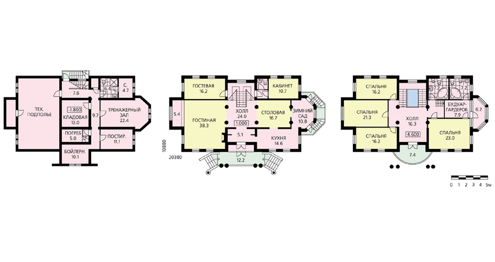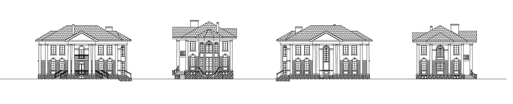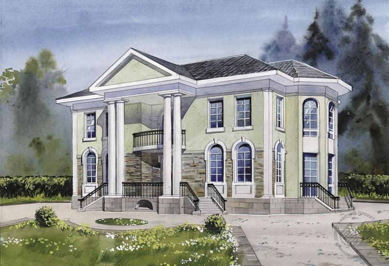 Великолепная архитектура фасадов, выдержанная в стилистике постклассицизма, элементы ордерной системы, парадные лестницы, репрезентативная внутренняя планировка делают этот дом похожим на дворец. Для такого сооружения потребуется большой, незатесненный участок. В доме два полноценных жилых этажа, технический этаж и неэксплуатируемый чердак. Вход оформлен четырехколонным портиком. Минуя прихожую, мы оказываемся в огромном свободном светлом пространстве, образованном лестничным холлом, гостиной, столовой и зимним садом, лишь условно поделенным колоннами. Такое решение позволяет устраивать здесь шикарные светские приемы и рауты. Второй этаж решен как комфортабельная спальная зона с великолепным просторным холлом, будуаром и двумя ванными комнатами. Из холла по небольшой деревянной лестнице можно подняться на чердак.