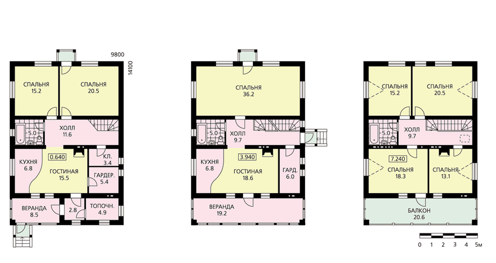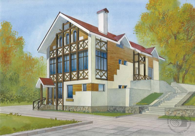 Проект дома для участка со значительным перепадом рельефа. Разность отметок составляет здесь более трех метров, эта особенность участка очень удачно обыграна в проекте. Так, на первый этаж мы попадаем с нижней отметки, а на второй – с верхней. Каждый из этих этажей решен как самостоятельная квартира на одну семью с гостиной, кухней, спальней и ванной комнатой. Между собой они связаны только по вертикали с помощью лестницы. Такая планировка может быть удобна для двух родственных семей, предпочитающих жить под одной крышей, но ценящих свою самостоятельность. Это могут быть семьи родителей и взрослых детей. Мансардный этаж решен как единая спальная зона, относящаяся ко всему дому в целом. Здесь расположены четыре спальни, две из которых имеют выходы на большой балкон. Лестничный холл освещается с помощью мансардного окна. Котельная расположена на нижней отметке при входе в дом.