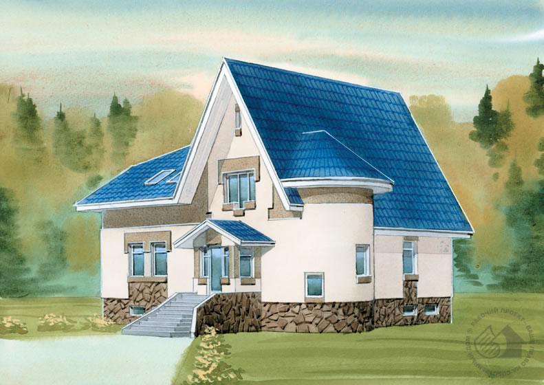 Кирпичный коттедж с очень необычным решением объема. Сочетание высоких острых фронтонов кровли с «мягкими», округлыми формами эркеров создает очень выразительный, неповторимый образ дома. При этом использование таких форм не является искусственным, надуманным, оно вполне функционально оправдано. В одном эркере расположена лестница, в другом – зимний сад. Всего же в доме три уровня: один жилой этаж, цоколь и эксплуатируемая мансарда. В цокольном этаже расположены служебные и технические помещения. Великолепный просторный зал может использоваться в соответствии с образом жизни хозяев дома. Это может быть бильярдная или тренажерный зал. Первый этаж – традиционно гостевая зона дома, где целый пролет занят гостиной, совмещенной с зимним садом. В мансарде расположены спальни. Планировка этого этажа может быть существенно откорректирована.