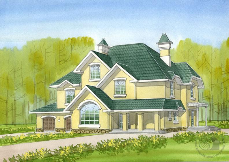 Большой по площади и пятну застройки коттедж, рассчитанный на многочисленную состоятельную семью. В доме пять спален, кабинет, гостиная, кухня-столовая и вместительный гараж на три автомобиля. В таком просторном, комфортабельном доме удобно жить, отдыхать и принимать гостей. Планировка позволяет использовать этот коттедж и как семейную гостиницу, каждая из спален имеет свою душевую или ванную комнату. Гостиная и кухня-столовая на первом этаже решены как единое пространство, площадь которого больше 70 м2. Из гостиной есть выход на террасу. Очень интересно решен второй этаж, он имеет три уровня. На нижнем расположены ванная комната и комната гостей. На втором уровне – холл-игровая и две спальни. Холл имеет высоту более 5 метров. Отсюда по лестнице можно подняться на антресоль, где находится еще одна небольшая спальня. В доме нет подвала, чердачные пространства не эксплуатируются.