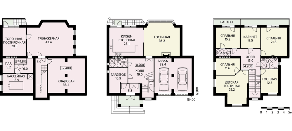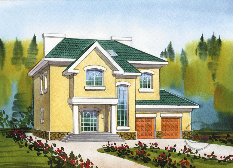 Этот большой и традиционный по своему облику дом рассчитан на состоятельную многочисленную семью. В доме два жилых этажа, очень активно эксплуатируемый подвал и чердак. Чердак по проекту не используется, но его высота, наличие окон верхнего свет и лестница, ведущая со второго этажа, делают это вполне возможным. Первый этаж функционально разделен на три части: гостевую, рекреационную и гараж. Гостевая зона, образованная гостиной и кухней-столовой решена как единое пространство, условно поделенное остекленной перегородкой. Рекреационная зона, предваряемая крытым крыльцом с колоннами, включает в себя тамбур, холл, просторную гардеробную и небольшой санузел. Из холла можно спуститься в уже упомянутый гараж, рассчитанный на две машины. Второй этаж – спальная зона. Планировка, выполненная в перегородках с единственной несущей внутренней стеной, позволит адаптировать это пространство под конкретные нужды семьи. В цоколе запроектированы помещения для отдыха с бассейном, сауной и просторной тренажерной, топочная – постирочная и кладовая.