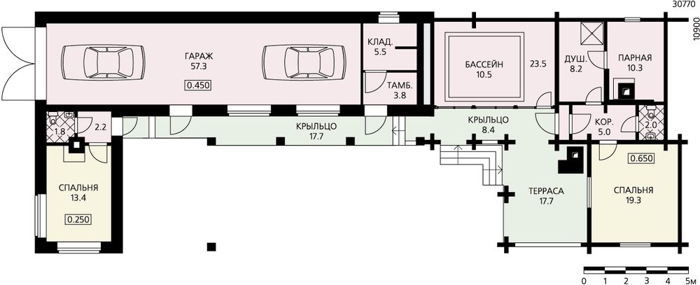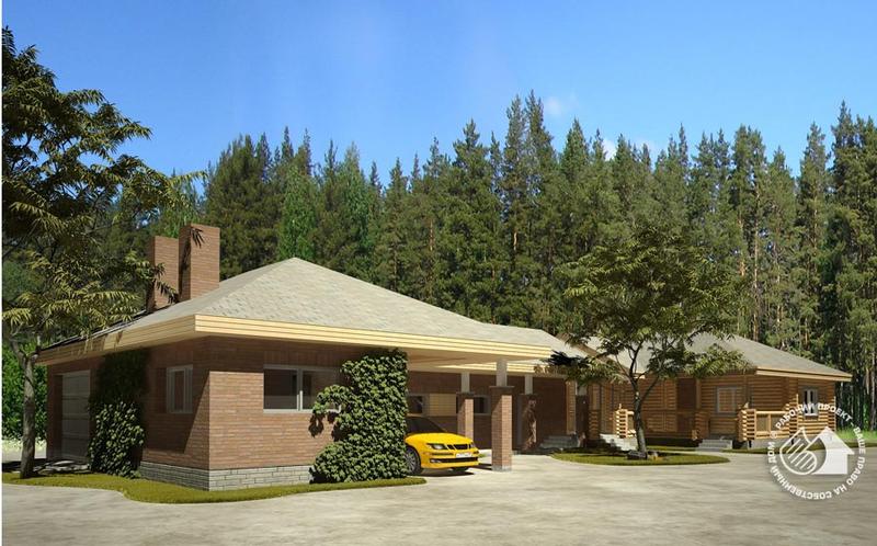 Сочетание функциональности и эстетичности, отличающее этот хоз. блок, довольно редкое качество для утилитарных построек. В один объем здесь объединены баня, гараж и два помещения для обслуживающего персонала. Предложенная планировка очень удобна для посадки здания на участок. Практически полностью глухой задний фасад, приближенный к красной линии, избавит от необходимости иметь забор. С противоположной же стороны, обращенной на участок, сформирован небольшой внутренний двор с крытой галереей вдоль гаража и террасой банного блока, где так приятно отдохнуть. Расположенние с торца въезда в гараж очень удобено, оно приближено к границе участка и избавляет от транзита транспорта по территории. Стены гаража и смежного с ним помещения персонала выполнены из газобетона, банный блок - бревенчатый. Изюминка планировки последнего – помещение бассейна с одной полностью остекленной стеной и прозрачной кровлей из закаленного стекла.