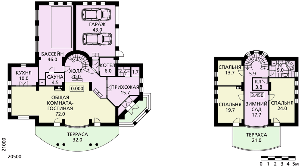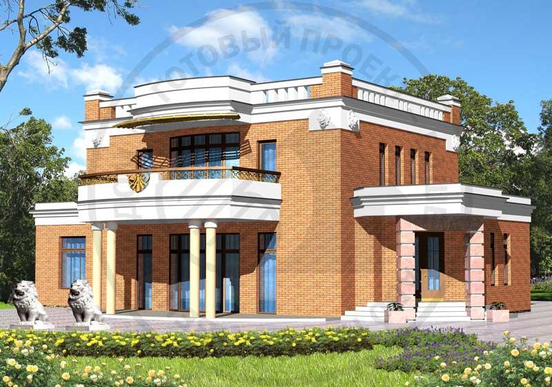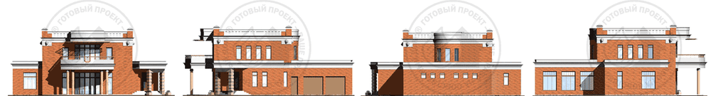 Коттедж, напоминающий небольшой изящный замок, рассчитан на респектабельную семью. Здание с большой открытой террасой, колоннадой в центральной части, тонко прорисованными архитектурными деталями и удобной планировкой помещений. Двухэтажный дом без подвала и цокольного этажа, объем бассейна и гаража отнесен к задней части центрального доминирующего объема.