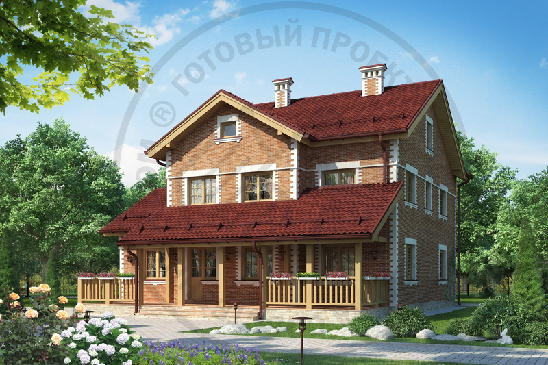 Вариант решения фасадной отделки одного из популярных проектов L-3028-0. Фасады решены в стиле небольшой английской усадьбы с традиционным кирпичом в качестве отделочного материала. От своего "собрата" его отличает и измененная планировка - расширенная терраса, отсутствие балкона на втором этаже и наличие мансардного этажа.