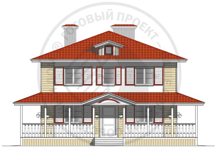 Первый этаж содержит стандартные помещения для общения и приема гостей: кухня-столовая, просторная гостиная. Кабинет-библиотека также может быть переоборудована под спальню. Второй этаж - приватная зона. Вокруг лестничного пролета сгруппированы четыре спальни и два санузла.