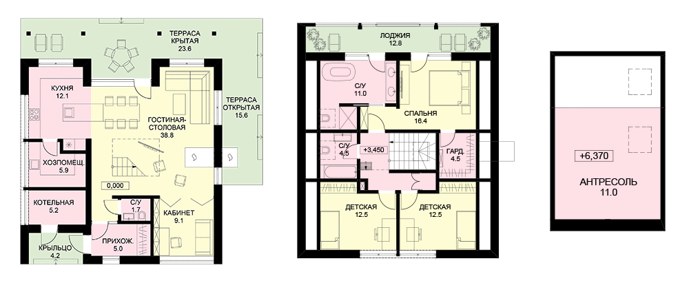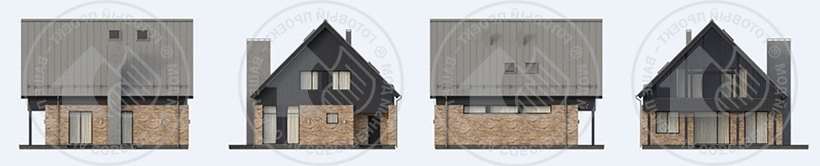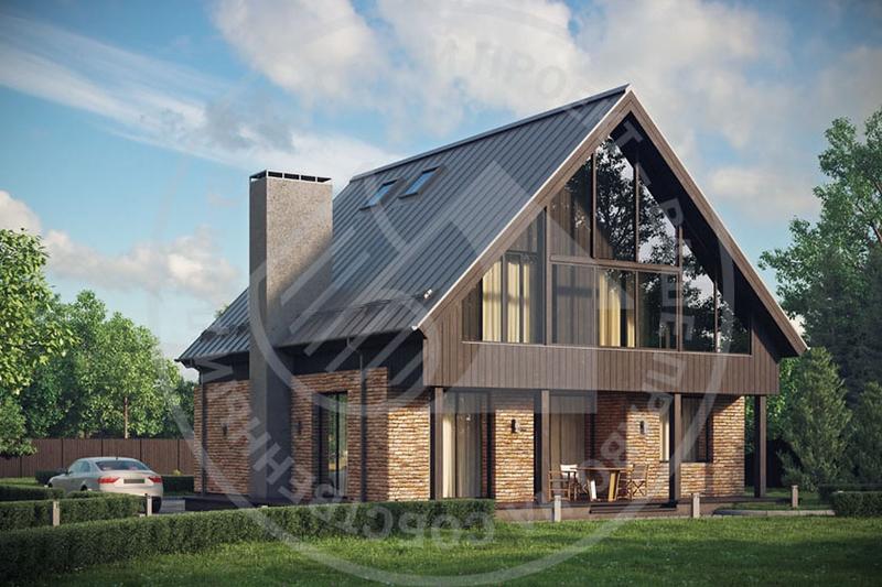 Актуальный оригинальный объем с использованием традиционных натуральных материалов делает дом уютным и современным. Большую часть первого этажа занимает общее пространство, которое можно разделить на несколько функциональных зон. Легкая лестница отделяет столовую и гостиную от входной части, а камин делает гостиную более камерной. Кабинет легко отделяется от общей зоны и может быть использован как гостевая комната. Хозяйская и детская зоны максимально удалены друг от друга и разделяются лестничным холлом, санузлом и гардеробной. Отсутствие несущих стен на втором этаже открывает широкие возможности для перепланировки. В антресоли в подкровельном пространстве можно организовать игровую, домашний кинотеатр или даже гостевую комнату