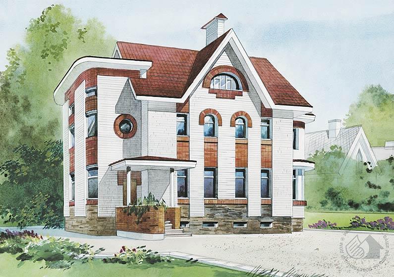 Представительный особняк для владельцев, не только ценящих комфорт и удобство, но и заботящихся о своем имидже. На первом этаже в организации взаимосвязи холла-прихожей, гостиной, кухни-столовой и веранды учтены различные жизненные стереотипы. При желании можно установить остекленную перегородку между прихожей и гостиной. В результате хозяева получат единое хорошо освещенное пространство гостиной-холла. Все варианты перепланировок второго этажа решаются за счет перестановки перегородок. Это касается и цокольного этажа. Мансардный этаж (на планах не показан) – простор для творческой фантазии владельцев. Площадь этого этажа включена в общую площадь дома.