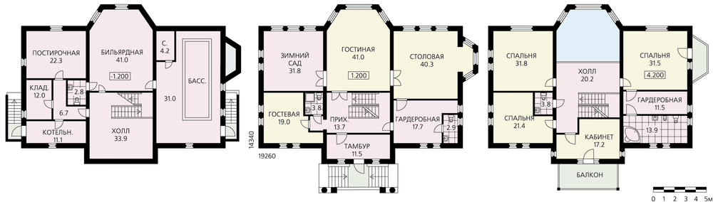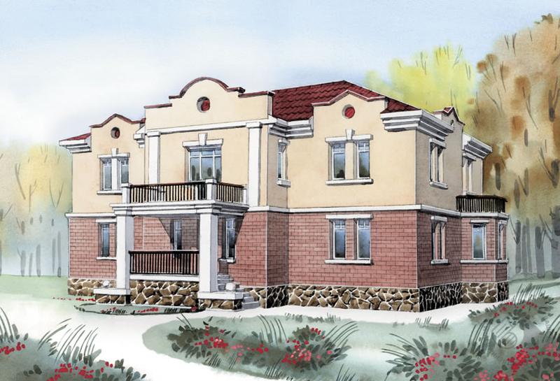 Большой представительный особняк по своей планировке и облику отвечает самым высоким требованиям, предъявляемым к зданиям такого класса. Симметричные фасады с классически решенными колоннами и пилястрами, с декоративными парапетами вызывают ощущения гармонии и стабильности. Строгую симметричность планов нарушает небольшой эркер столовой. В доме три основных этажа и большая по площади мансарда, не показанная на планах. В цокольном этаже предлагается разместить бассейн, бильярдную и технические помещения. Первый этаж представляет собой гостевую – парадную зону дома. По обе стороны от гостиной расположены столовая и зимний сад. На втором этаже вокруг лестничного холла – четыре спальни, одна из них – с балконом, гардеробной и ванной комнатой – имеет повышенный уровень комфорта.