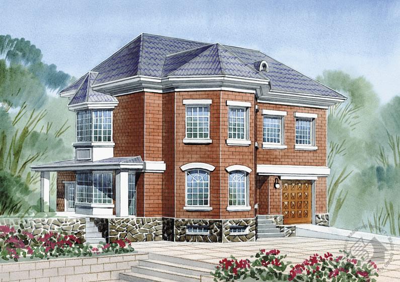 Сочетание несколько консервативного внешнего вида и современной свободной планировки – отличительные черты этого дома. Образ классического особняка, созданный характерными для этого стиля элементами и выдержанный в классических пропорциях, позволит вписать его в любую среду, будь то городская застройка или живописный пригород. А гибкая внутренняя планировка может быть приспособлена под самый разный уклад жизни семьи. Так, пространство гостиной, кухни-столовой и холла первого этажа разделены достаточно условно с помощью раздвижных перегородок. Это позволяет трансформировать его в зависимости от потребности семьи. И планировка второго этажа, также выполненная в перегородках, может быть изменена. Можно изменить форму и площади спален, а на месте холла-игровой разместить жилую комнату.