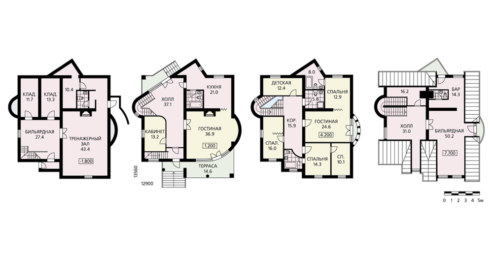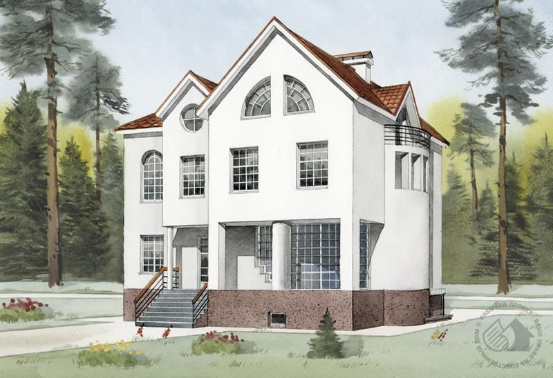 В проекте этого дома все подчинено идее рациональности и лаконизма, впрочем, не в ущерб комфорту и эстетике. Выразительность внешнего облика дома достигается не за счет элементов декора, а формируется самой конструктивной схемой дома и пластикой фасадов. Строгую геометрию квадратного в плане объема нарушают полукруглый эркер гостиной и расположенная под углом лестница. Первый этаж высоко поднят над землей, и попасть на него можно по высокой лестнице. На первом этаже расположены большая, красивой формы гостиная, смежная с ней кухня и кабинет. Кабинет может использоваться как спальня старших членов семьи. В цокольном этаже находятся большой тренажерный зал, служебные и технические помещения, во втором – спальни и еще одна гостиная.