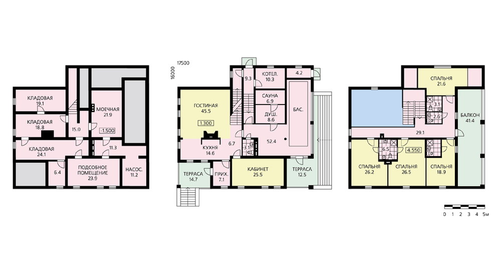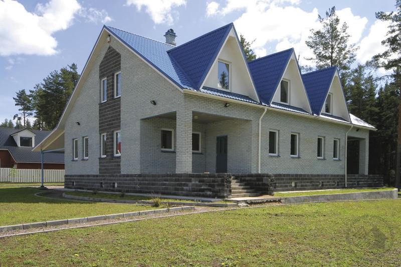Внешне очень лаконично решенный дом привлечет к себе внимание комфортной и достаточно необычной планировкой. Львиную долю первого этажа занимает бассейн, размеры которого вполне позволяют устраивать здесь дружеские, спортивные состязания. Летом прямо из бассейна по широкой, «дворцовой» лестнице можно спуститься в сад, а зимой отдохнуть у камина в гостиной. Гостиная и кухня-столовая образуют единое, условно поделенное пространство. Кабинет хозяина дома дополняет планировку первого этажа. В мансардном этаже – четыре просторные спальни, каждая из которых имеет свой санитарный блок. Примечателен и огромный балкон, габариты которого позволяют поставить здесь теннисный стол. Стоянка для машин организована рядом с домом под навесом.