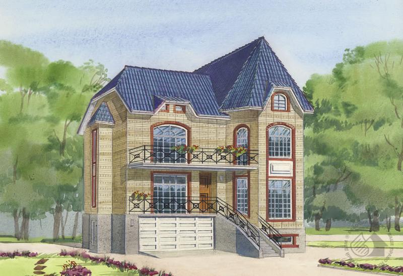 Дом, внешний облик которого формирует трехгранный эркер главного фасада. Решенный в виде башни с высокой шатровой кровлей и большими остекленными витражами, это настолько выразительный архитектурный акцент, что он полностью доминирует во внешнем облике. Дом очень высокий, в нем три этажа, подвал и чердак. Часть цокольного этажа, в котором расположен гараж, находится на отметке земли, тренажерный зал и топочная – на пол-этажа ниже. Первый этаж почти на три метра поднят выше отметки земли, и на него ведет красивая, парадная лестница. Центральное место в его планировке занимает просторный светлый холл с широкой трехмаршевой лестницей. На одной отметке с холлом расположены кабинет и гардеробная, на несколько ступенек ниже – гостиная с кухней-столовой. Второй этаж – приватная зона дома, где на три спальни приходятся одна ванная комната и санузел. По проекту чердак не эксплуатируется, и на планах он не показан.