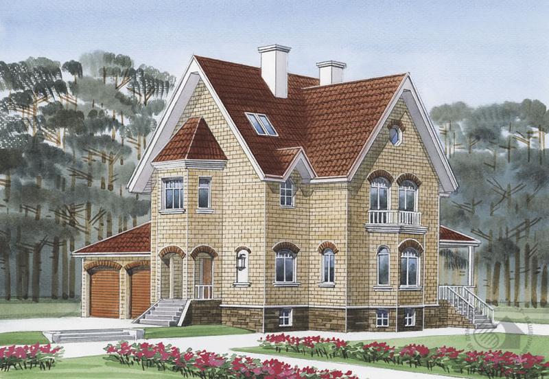 Ощущение уюта, домашнего тепла и комфорта возникает сразу при взгляде на этот дом. Выполненный в лучших традициях коттеджного домостроения, он может стать оптимальным решением загородного жилья для большой состоятельной семьи. Отдохнуть, расслабиться и приятно провести время можно в зоне релаксации цокольного этажа. Собраться всей семьей у камина – в просторной гостиной, отсюда же можно выйти на большую крытую террасу. Небольшая комната на первом этаже может служить помещением охраны или прислуги. Всем многочисленным домочадцам с лихвой хватит места в спальной зоне дома на втором этаже. Четыре просторные светлые спальни, оборудованные ванной, санузлом, гардеробной, – уютны и комфортны. В доме есть просторный светлый чердак, он не показан на планах. Пристроенный гараж на два автомобиля выполнен в легких конструкциях.