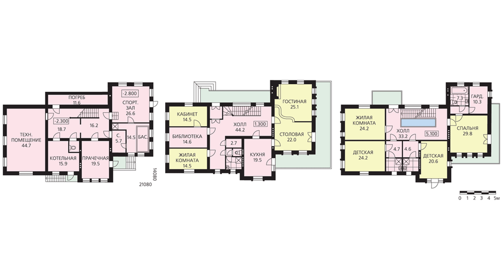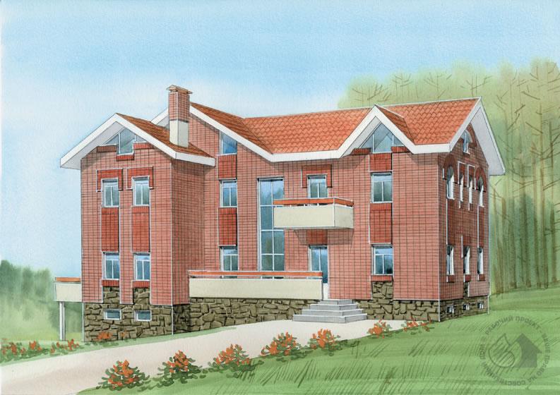 Большой респектабельный особняк для многочисленной состоятельной семьи. По конструкции наружных стен это комбинированная постройка, где первый этаж выполнен из кирпича, второй – из оцилиндрованного бруса, облицованного кирпичом. По объемно-планировочному решению это современный особняк с высоким уровнем комфорта, построить который можно и на участке с перепадом рельефа. Цокольный этаж традиционно отведен под служебные и технические помещения, зону релаксации с сауной, бассейном и тренажерным залом. Незначительное заглубление позволяет обеспечить естественное освещение и выходы на улицу. Первый этаж – гостевая зона дома, где под гостиную и столовую отведен целый пролет. Эти помещения зонированы уровнем пола и небольшой остекленной перегородкой. Из кухни и столовой можно выйти на великолепную угловую террасу. Второй этаж – спальная зона. Назначение мансарды (ее площадь не включена в общую площадь дома) определят хозяева дома.