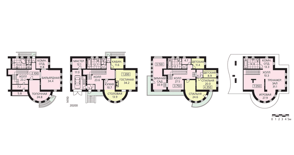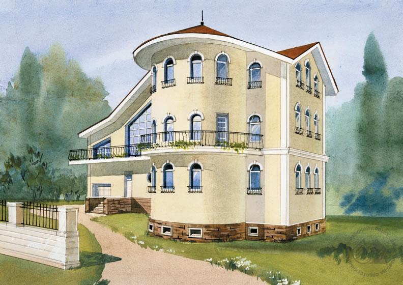 Большой, респектабельный особняк, облик которого формирует полукруглый эркер главного фасада. Дом очень вместительный, с четырьмя этажами и большим пятном застройки. Жилые помещения расположены на двух этажах. В цокольном этаже находятся служебные и технические помещения. Просторная бильярдная, комната отдыха и ванная образуют единый блок помещений со своим выходом на улицу. Первый этаж высоко поднят над землей, сюда ведут два входа: один – парадный – с главного фасада, и второй – служебный – с заднего, дворового. Центром композиции является просторный холл-прихожая, справа от него расположены гостиная, кухня, столовая и кабинет. В гараж можно попасть как с улицы, так и из дома через тамбур. Второй этаж – спальная зона дома. Нетрадиционным и очень выигрышным решением планировки является великолепный зимний сад-веранда. В мансарде по проекту предложено разместить тренажерный зал с комнатой отдыха и игровую.