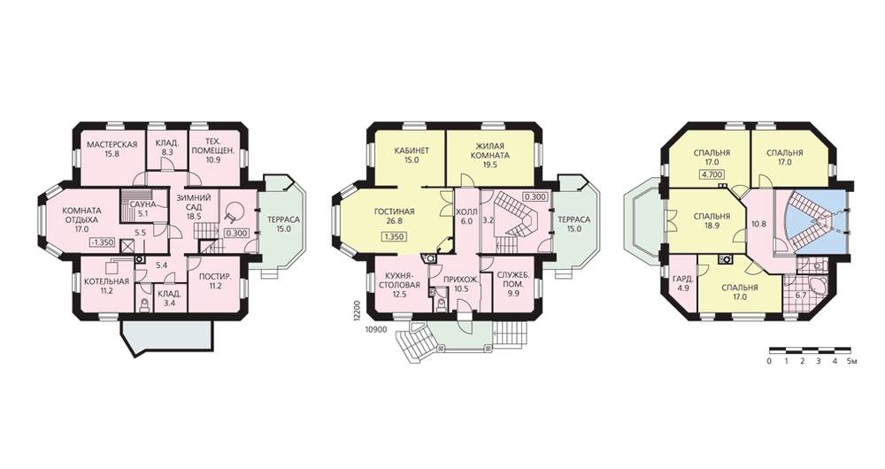 «Дом на берегу реки» – красивый современный особняк с достаточно редким конструктивным решением. В своей основе оно имеет несущий стальной каркас с заполнением типа сэндвич и наружной облицовкой кирпичом. Поэтому к кирпичным домам его можно отнести лишь условно. В цокольном этаже запроектирован комплекс банных помещений с комнатой отдыха и зимним садом. Из зимнего сада организован выход на террасу с камином-барбекю. На первом этаже расположена гостевая часть дома, где гостиная, кухня-столовая и кабинет составляют единый блок помещений. Планировку дополняют жилая комната и небольшое служебное помещение. Мансарда – спальная зона дома, решена очень экономично и в то же время комфортно. Здесь удалось избавиться от скосов на потолках благодаря диагональной форме скатов кровли. Междуэтажная лестница, выделенная в отдельный объем, решена как ажурная конструкция, парящая среди зелени зимнего сада.