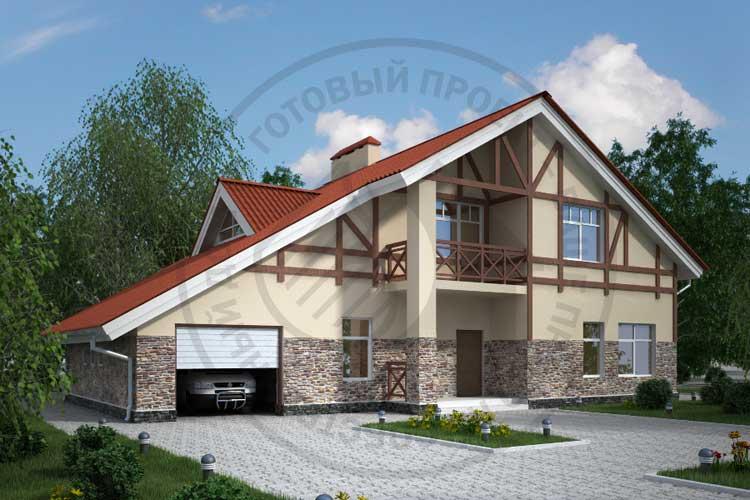 Комфортабельный, рациональный загородный дом. Сочетание таких качеств достигается продуманной планировкой и лаконичным, но выразительным решением фасадов. В доме один этаж и мансарда, подвал отсутствует. Жилая часть дома и гараж заведены под одну кровлю. На первом этаже целый пролет отдан под гостиную и кухню-столовую. Эти помещения разделены камином и небольшой перегородкой. При желании от нее можно отказаться. Часть гостиной – двусветна. Небольшая жилая комната может служить гостевой, спальней или кабинетом. Планировку первого этажа дополняют большая ванная комната, кладовая и топочная со своим выходом на улицу. Мансарда – традиционно спальная зона дома. В данном случае она представлена просторной спальней хозяев и двумя небольшими детскими спальнями. Если есть необходимость в дополнительных площадях, то второй свет гостиной можно перекрыть и получить еще одну спальню.