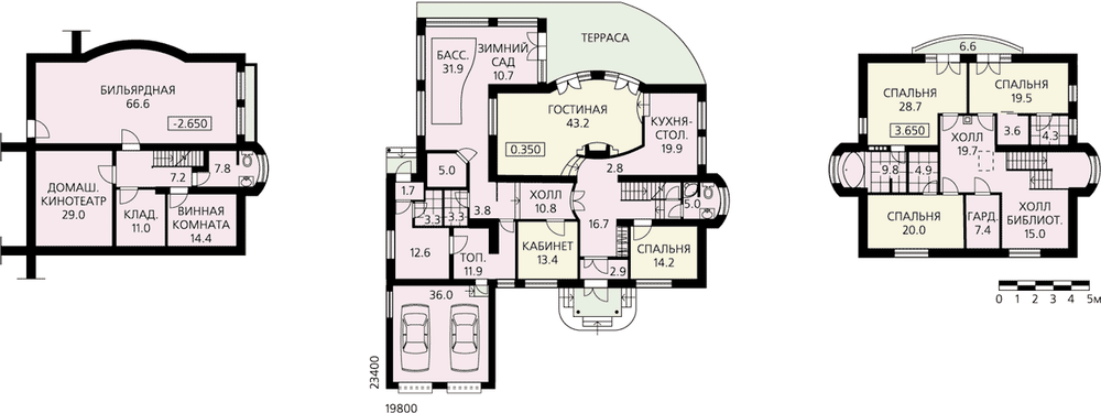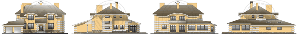 Повышенный уровень комфортности, бесспорно, отличительная черта этого большого респектабельного особняка. Причем в полной мере это относится к каждому из трех этажей. В цокольном этаже разместились домашний кинотеатр, просторная бильярдная с барной стойкой. Из бильярдной можно попасть в техническое помещение, смежное с чашей бассейна. Планировка первого этажа имеет максимальное функциональное наполнение. Все его помещения можно разделить на три части: жилые помещения, зона релаксации и технические помещения. Жилая часть решена с размахом и фантазией. Гостиная и кухня-столовая задуманы в едином объеме, который зонирован с помощью перепада отметок пола. Мягкий, полукруглый эркер добавляет шарма этому пространству. Небольшая спальня и кабинет дополняют планировку. На втором этаже расположены три спальни и холл-библиотека. Каждая из спален оборудована своей ванной комнатой.