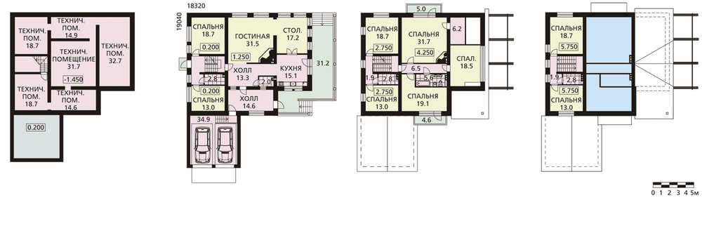 Весь подвал отдан под технические помещения, в которых можно проложить коммуникации. Первый этаж - зона для приема гостей и отдыха: здесь расположена большая гостиная, столовая, две спальни и два просторных холла. Второй этаж традиционно спальный, здесь находится пять спален. Также две спальни запроектированы и в мансардном этаже.