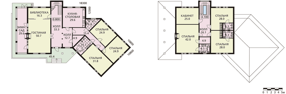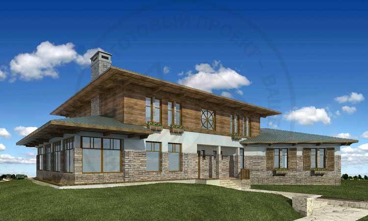 Респектабельное шале со своеобразным, нетрадиционным планировочным решением для многочисленной современной семьи. Правая часть первого этажа, находящаяся по углом к основному объему дома - спальная зона, состоящая из трех спален со своим просторным санузлом, в котором можно разместить джакузи. Левая часть дома для приема гостей: здесь расположена большая гостиная с камином, из которой можно выйти в зимний сад. Второй этаж отдан под три просторные спальни и один кабинет, который также может использоваться и как спальня или, например, игровая.