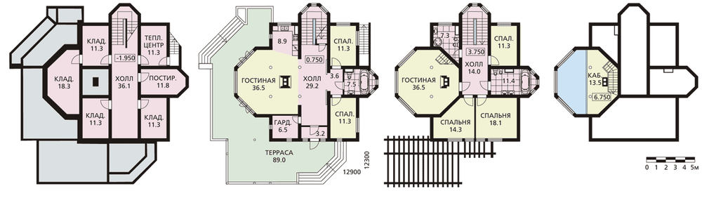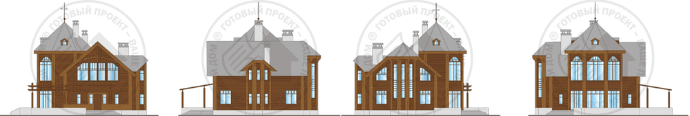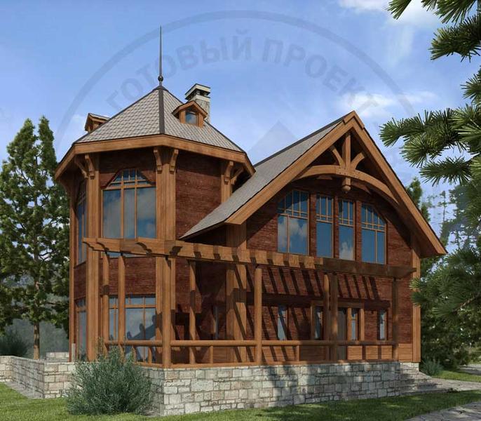 Дом из бруса имеет оригинальное планировочное решение. Подвал отдан под технические помещения - кладовки, постирочные. Несимметричные комнаты первого этажа придают планировке определенную динамику. В то же время все просто: идеологически этаж поделен на приватную зону, где находятся две спальни и комфортный санузел, и зону для отдыха с просторной гостиной, имеющей два выхода на террасу. На втором этаже также расположена гостиная в форме восьмигранника с камином, идущим с первого этажа, три спальни и два санузла. В составе мансарды небольшую антресоль можно оборудовать в диванную комнату.